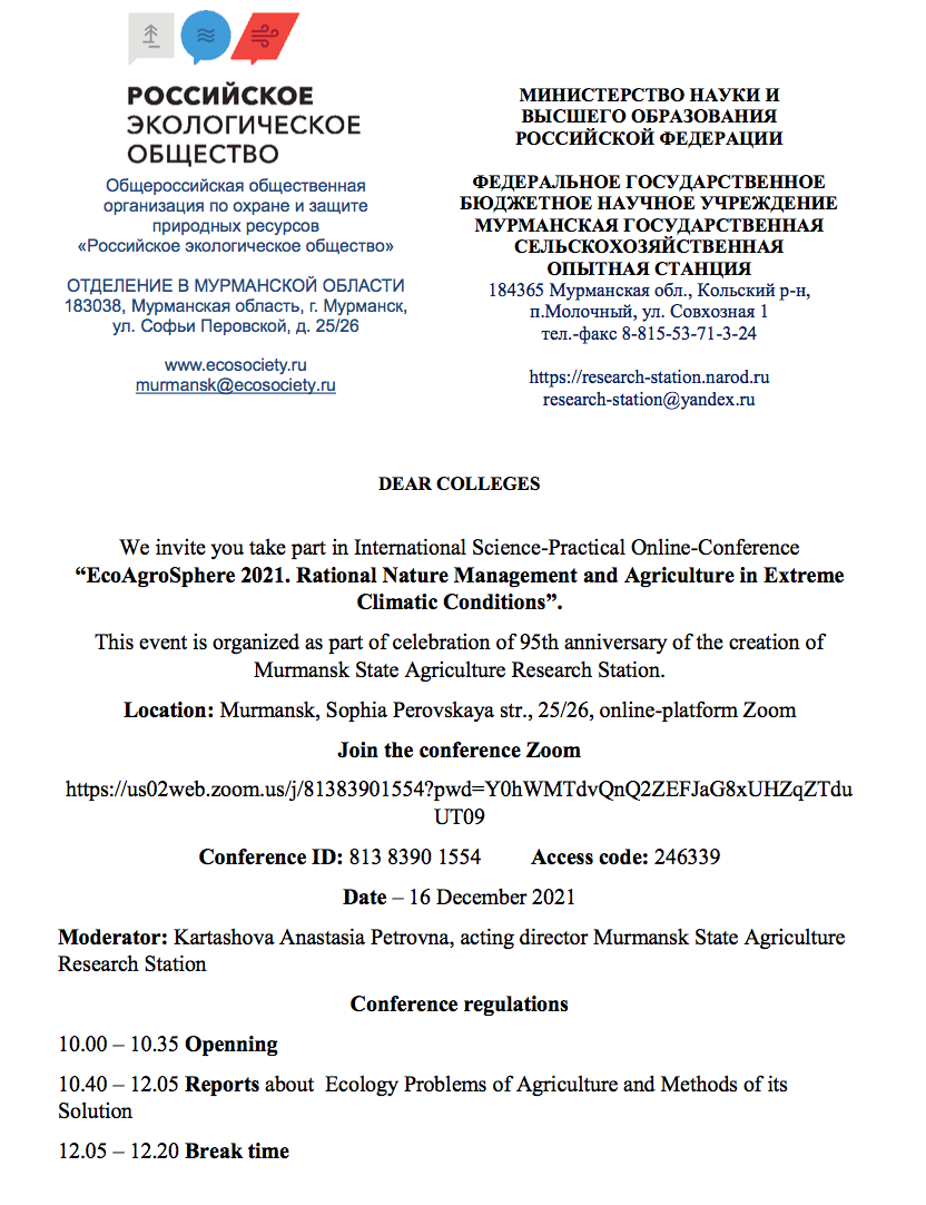 北京时间12月16日下午,生命科学学院熊友才教授受俄罗斯摩尔曼斯克国家农业研究站代理主任Kartashova Anastasia Petrovna邀请,参加庆祝摩尔曼斯克国家农业研究站成立95周年线上会议。会议主题为“生态农业领域:极端气候条件下的合理自然管理和农业”。会议由Kartashova Anastasia Petrovna主持,会议分三个议题,分别探讨了农业生态问题及其解决方法;农业组织应对农业生态问题及其解决方法以及极端条件下的动植物。首先由地区分会主席,摩尔曼斯克地区杜马代表Ivanov Maxim Anatolevich、摩尔曼斯克地区杜马副主席Nikora Evgeny Viktorovich和委员会主席,摩尔曼斯克地区杜马代表Ivanov Andrey Stepanovich,分别介绍了俄罗斯摩尔曼斯克国家农业研究站的发展历程和取得的一系列成果,以及再未来气候变化背景下研究站所担负的使命。